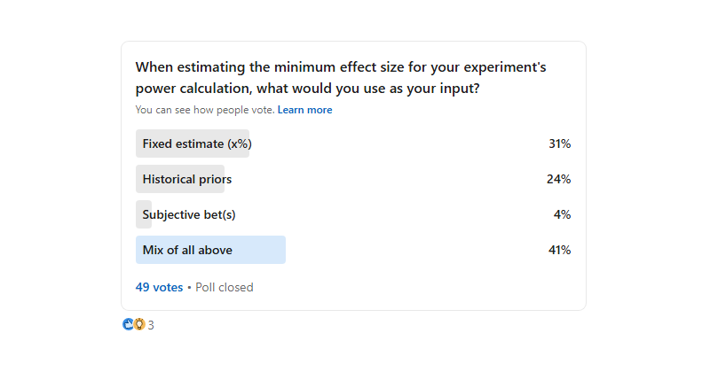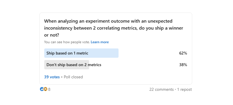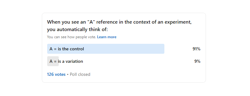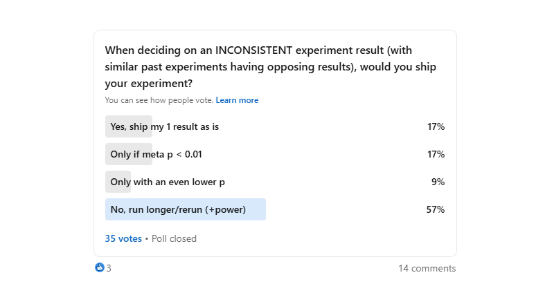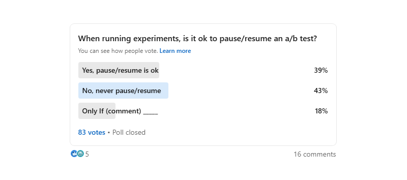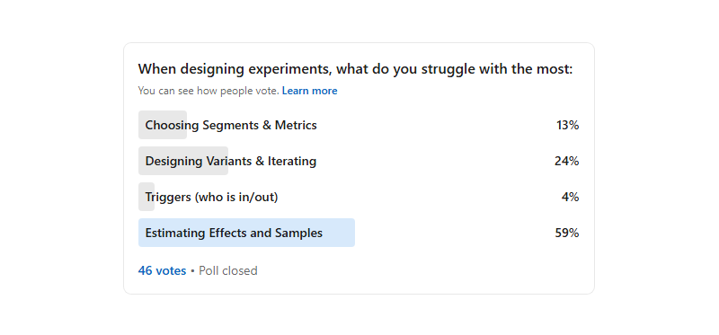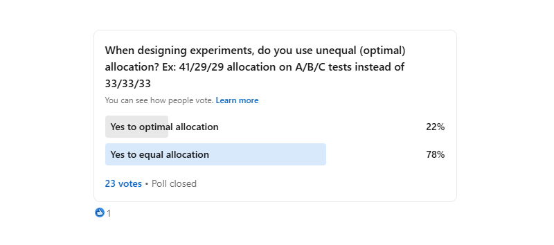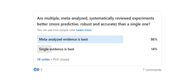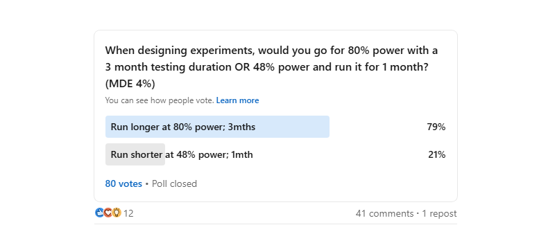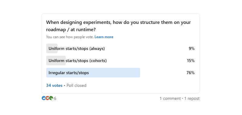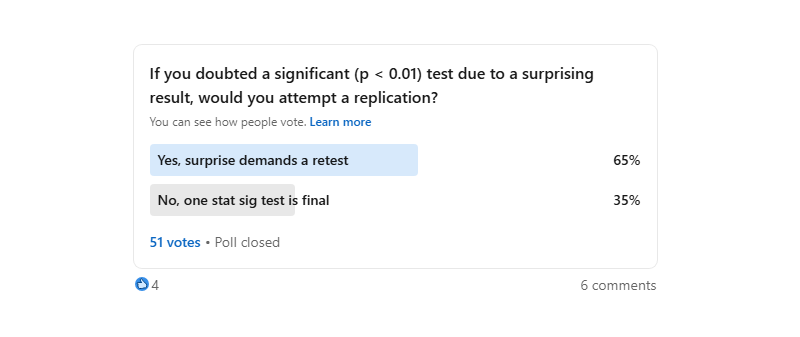 Over the last two years, I’ve run more than 40 LinkedIn polls on topics related to experiment design. The goal was to test, challenge, and refine common beliefs—and to engage more experienced practitioners in open discussion.