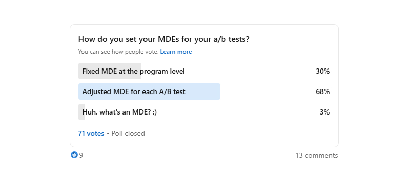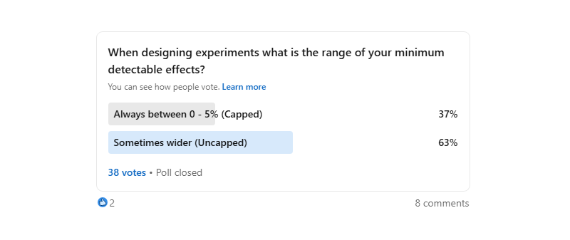 Poll 06: When designing experiments, how do you set your MDE (minimum detectable effect or minimum effect of interest) to power up your a/b tests? 1. Are they fixed and handed down to you at the program or team level (and you always work with the same MDE value between multiple tests)? 2. Or do you adjust them for each A/B test (perhaps some are bigger/smaller based on whatever factors, beliefs, historical data, expectations, or inputs you come across)?