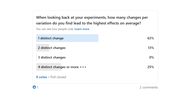 Poll 08: Looking at the complexity of your experiments, how many changes per variations leads to the highest POSITIVE effects on average?