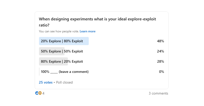 Poll 09: When designing experiments, what does your ideal EXPLORE / EXPLOIT ratio look like? Purely exploratory experiments are ones you have no previous quant/qual information about, touching randomness (if that's even possible). Exploit experiments are fueled by data, insights, past tests, knowledge. These may also include iterations and replications.