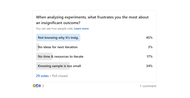 Poll 11: Given that a large portion of people in experimentation may be frustrated at times by an insignificant outcome (I feel the pain), what's the cause of this frustration?