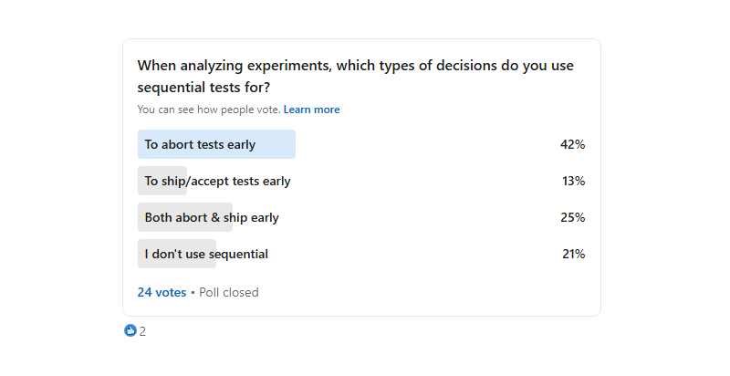 Poll 15: Some experimenters only rely on sequential tests to abort early (ex: negative or undesirable results), while others use it for both abort & ship decisions (ex: neg and positive results). Aside of the various flavors of sequential, what's your take on this?
