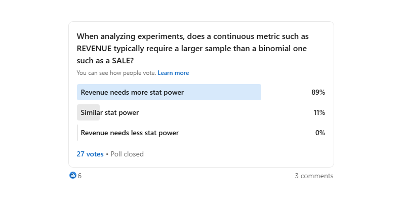Poll 24: When you measure revenue, do you typically find that it needs a larger or smaller sample to achieve the same stat power as a binomial (ex: such as a transaction or sale)? I understand that the answer is bound to standard deviation of revenue, but what do you typically see?