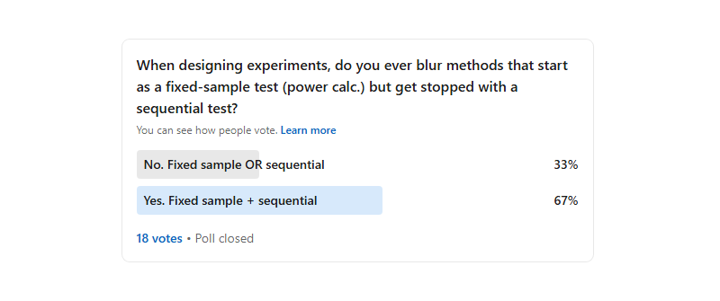 Poll 25: When you design experiments, do you ever blur methods by adding some stopping agility to a fixed sample experiment? Or do you stick to your guns till the end as the experiment was designed.