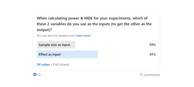 Poll 26: When designing experiments and calculating minimum detectable effects / power, what is your known input? Is it ... sample size or effect estimates first?