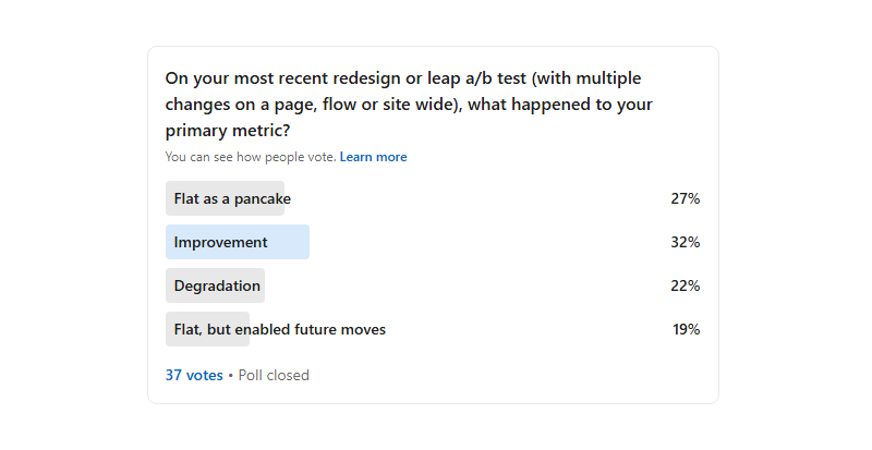 Poll 29: When looking back at experiments you ran, how did that last "redesign" a/b test go for you?