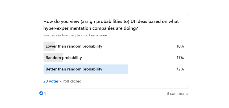 Poll 34: If you observe what experimentation leaders (Amazon, Netflix, Etsy, Bol, Airbnb, Microsoft, Walmart, Best Buy, etc.) are doing, what type of bets are you making on ideas based on their latest UI ideas and iterations? Below random, random, or above random probabilities?