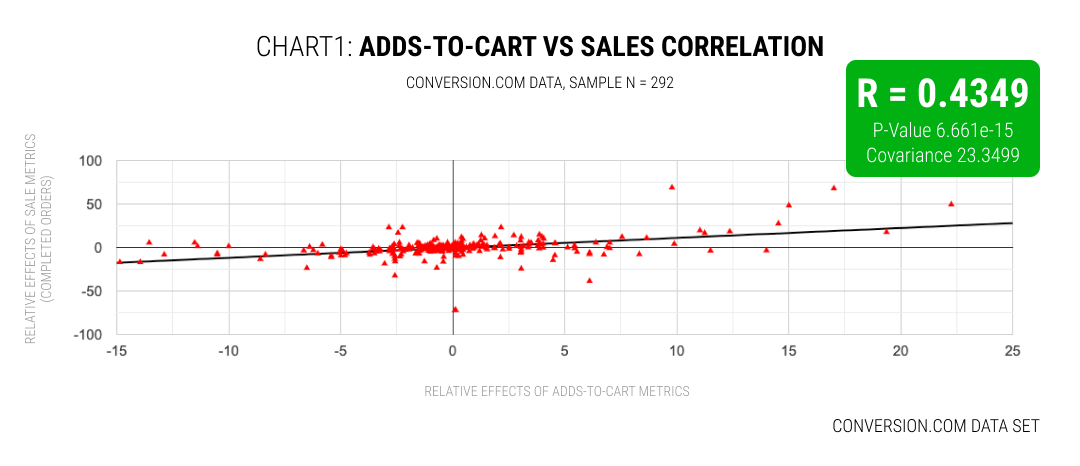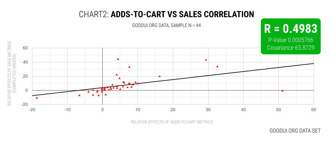 In our own analysis I queried the GoodUI database for A/B tests that contained both: adds-to-cart and sales metrics (orders, transactions, etc.). This resulted in a sample of 44 experiments which were then entered into the Correlation Coefficient Calculator (from Statistics Kingdom). The result came out to be equally similar to the Conversion.com data set with a medium correlation of R = 0.4983 and statistical significance.