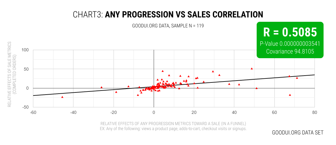 Given that the 44 experiments wasn't a big sample, I also tried to broaden the search. In this next set I queried experiments with any progression metrics such as: a step forward in a purchase funnel towards the direction of a sale, adds-to-cart, checkout visits, shopping cart visits, including 4 signup/lead form experiments that also lead to sales. With this broader query we were able to analyze 119 A/B tests in total. The result of this analysis continued in the direction of a similar trend with a medium correlation of R = 0.5085 and even higher statistical significance.