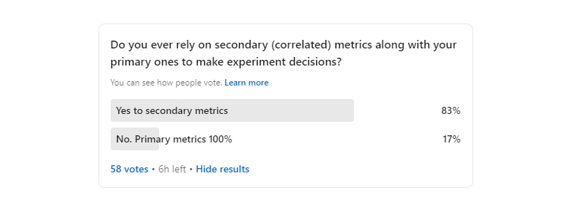 Building on this topic, a week ago I also ran a LinkedIn poll asking if others rely on secondary metrics while making decisions about their a/b tests. According to the poll results, the consensus seems heavily skewed (83%) towards incorporating such metrics.