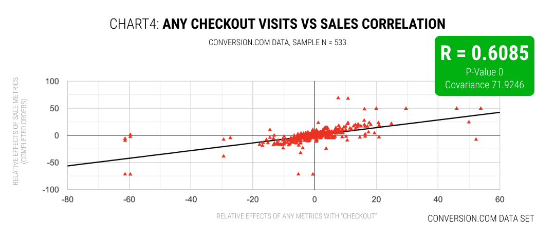 In this fourth analysis, Michael explored a hunch about correlations potentially becoming stronger as customers progress further towards checking out. To confirm this, he agreed to perform one more analysis involving "any checkout visits" vs sales. These checkout metrics included a variety of shallow (early) and deeper (later) checkout step visits across funnels. Interestingly, in this new sample of 533 experiments we can notice the stronger correlation of R = 0.6085 along with an ultra significant result (p-value near 0). So the data confirms Michael's intuition.