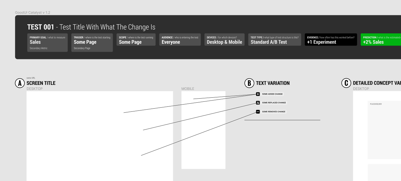 I'm continuing to make gradual improvements to the freely available GoodUI Catalyst Canvas for Figma. The purpose of this template (which I use on real projects by the way) is to encourage others to design better experiments. This minor release focuses on two ways of actually doing less design work, with some improvements to clarity. Here is what's new in the latest version.