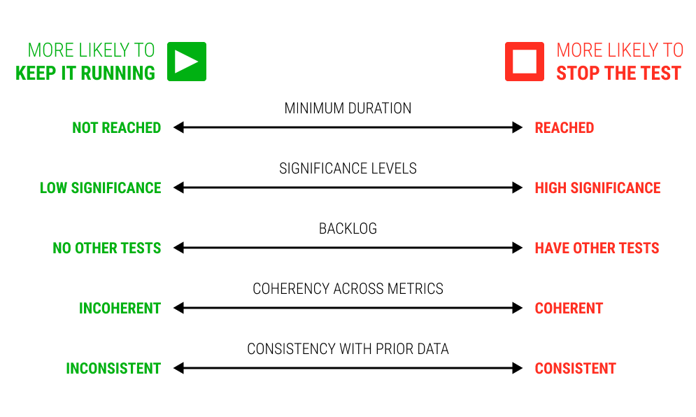Experimentation practitioners want to stop their a/b test at the most optimal time. If an experiment runs too long, it delays potential improvements. On the other hand if it runs too short, we risk deciding incorrectly based on noisy results. As a result, most practitioners might take a reasonably simple approach and set a fixed testing duration or use a dynamic stop rule (ex: tied to some significance threshold). However as a practitioner myself, I find that other factors have crept up on real projects that made stopping decisions a little messier. And so, here are 5 criteria that I consider when deciding to stop an a/b test or keeping it running.