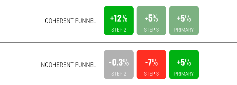 Below is an example of this. The first set of metrics are more coherent. And personally, I've stopped and rolled out such a/b tests even if the final or primary metric wasn't significant but positive (with initial metrics being both significant and positive). The second example shows metrics that are all over the place. And this might not be adequate to stop and implement even if the primary metric is significant.