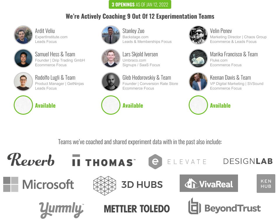 Over the years we have currated successful experiments from such leading companies as Microsoft, Reverb, Yummly, Thomasnet, Volders, Backstage, etc.