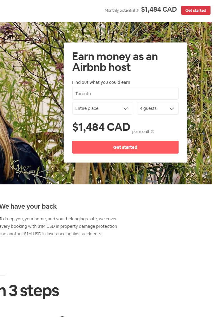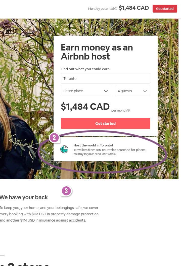 In variation B we can see an added message under the "Get Started" signup button. The message hints that 39% of nearby listings are fully booked this week and this ought to encourage hosts to put up their listings. One guess as to why this message might not have worked is that the 39% booking rate feels a little low (at least to me). If hosts landing on this page might also have felt similar doubt about that their homes being rented, then the message could have backfired.