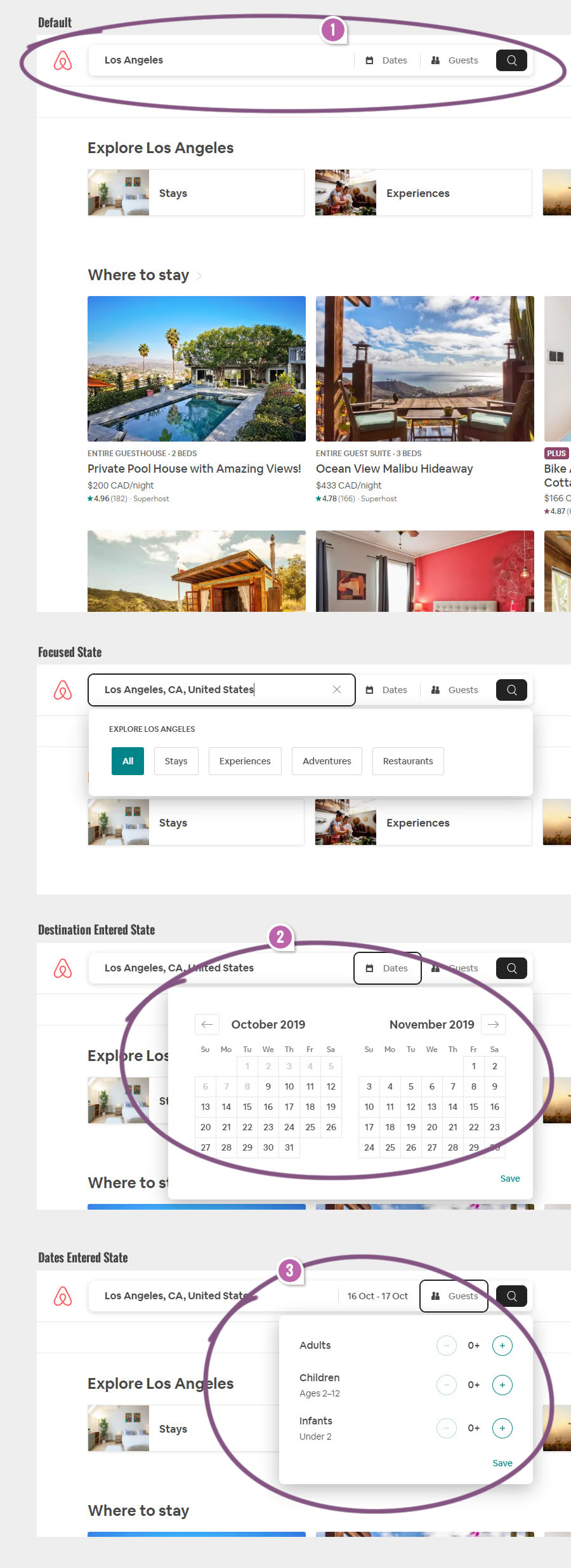 Upon selecting dates, the same interaction continued on, prompting users to also enter the number of guests.