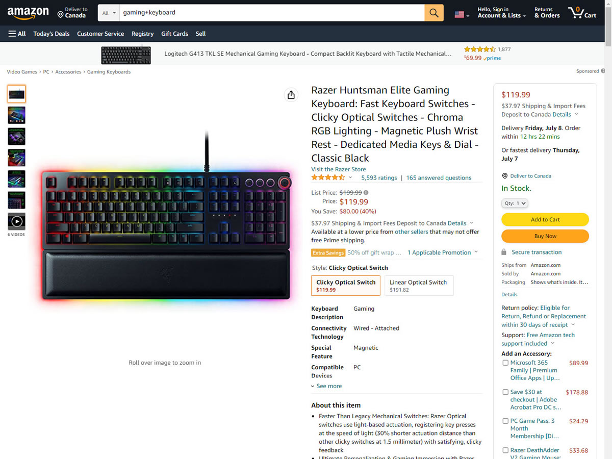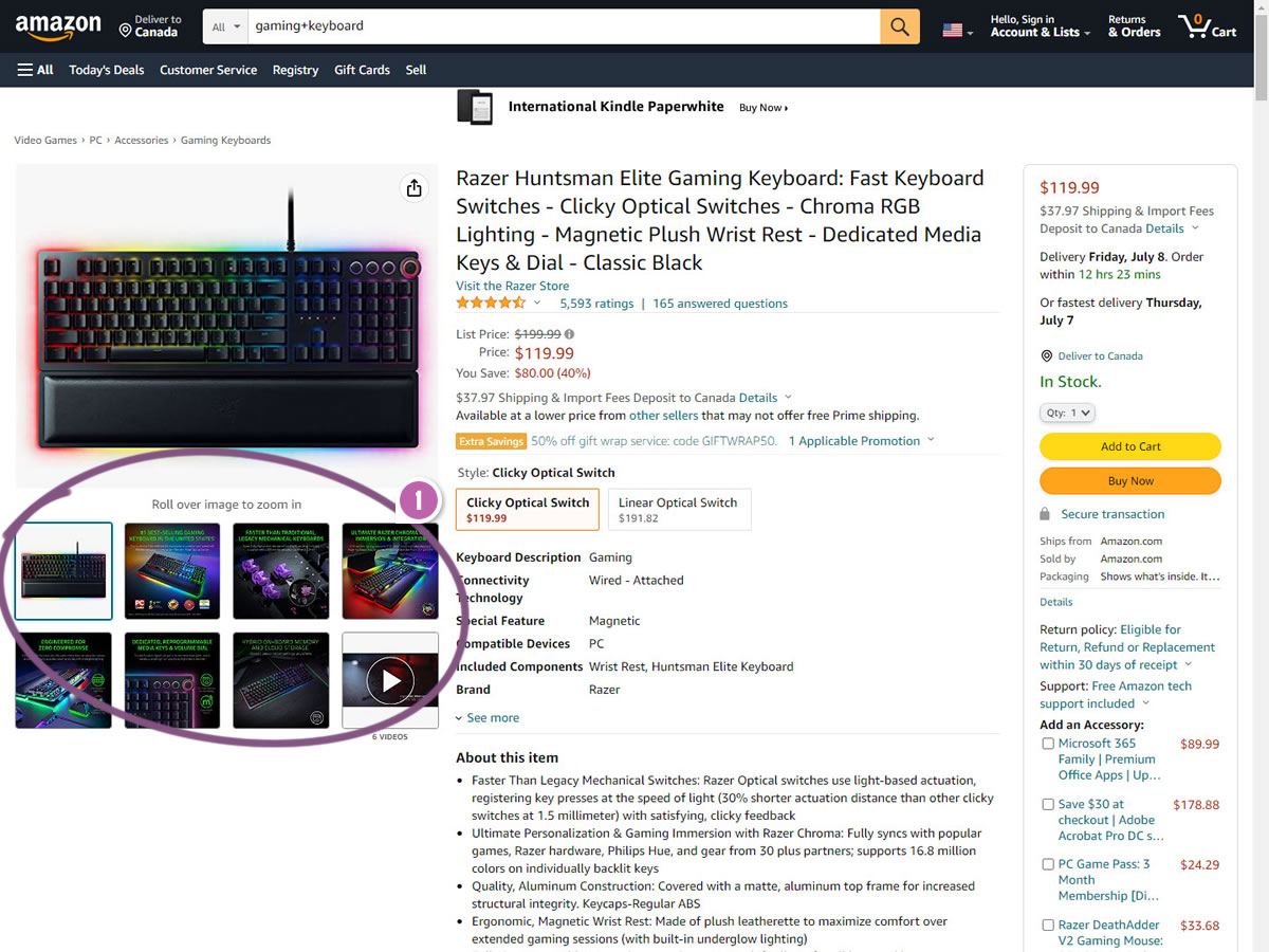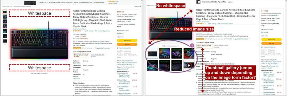 If we look more closely at the variation, we can detect at least 3 key characteristics. First, the position of the thumbnails was shifted below the primary image. Secondly, the size of the thumbnails was increased. And finally, product qualities were also added (ex: "Best selling keyboard in the United States" or "Faster than traditional mechanical keyboards").