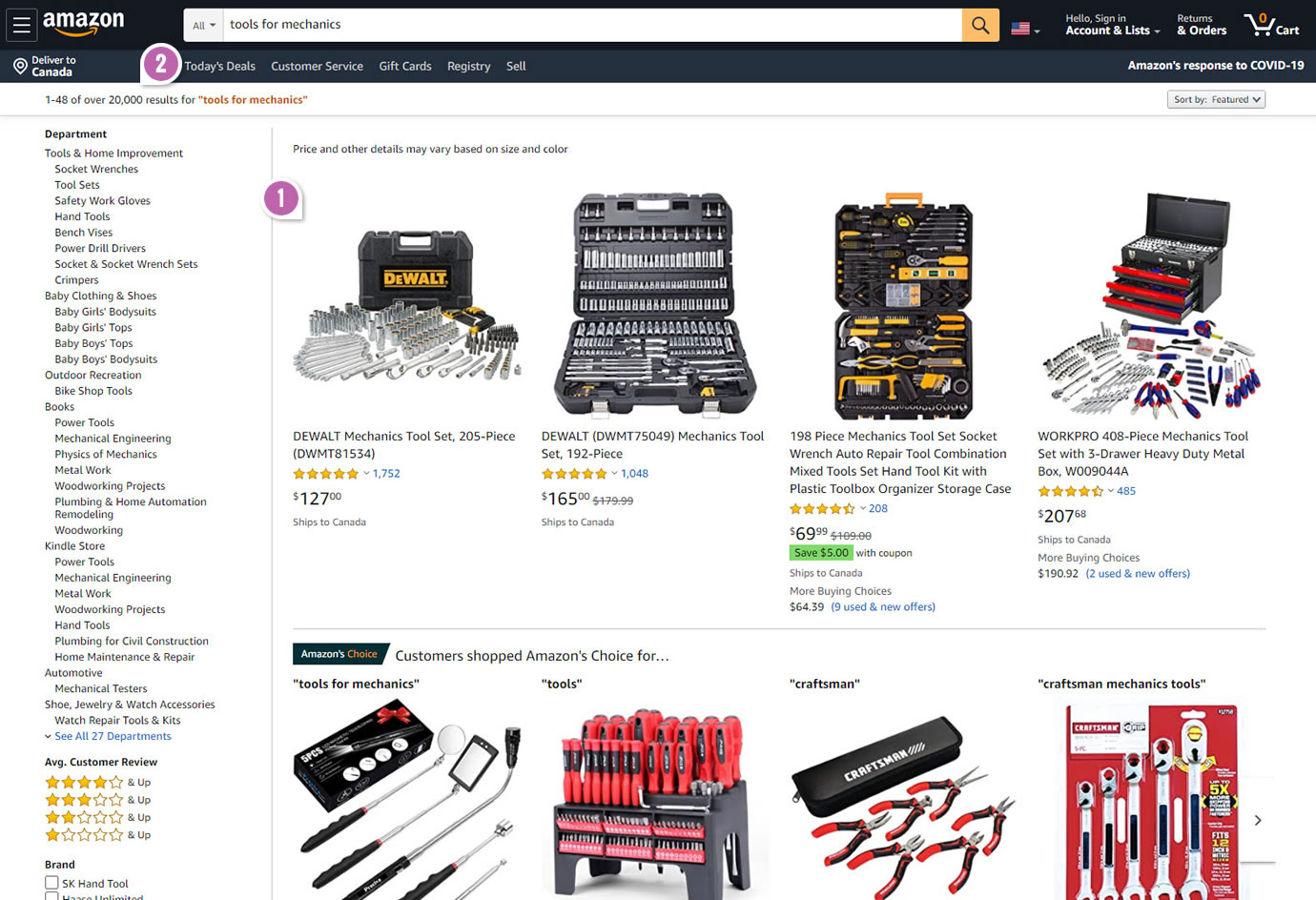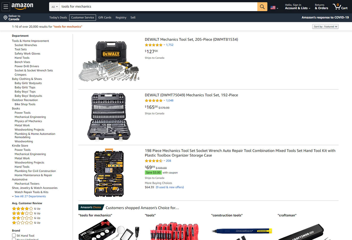 A month ago I managed to detect this classic list vs grid layout experiment on two of Amazon's product listing pages. I learned that this a/b test ran at least on two random queries such as "tools for mechanics" and "sports gear". Today, the grid layout view now looks like it was implemented - providing some evidence in favor of list vs grid view pattern and more results.