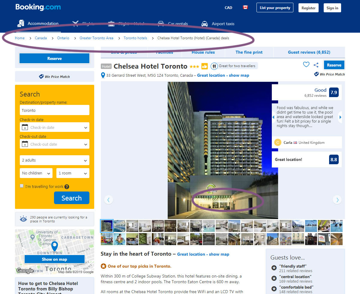 In the control version, we see a traditional breadcrumb which simply shows the depth of hierarchy (geography) along with where a user is in. The breadcrumb also allows moving backwards to any of the previous levels by clicking on the links (Home, Canada, Ontario, Toronto, etc.) Classic stuff.