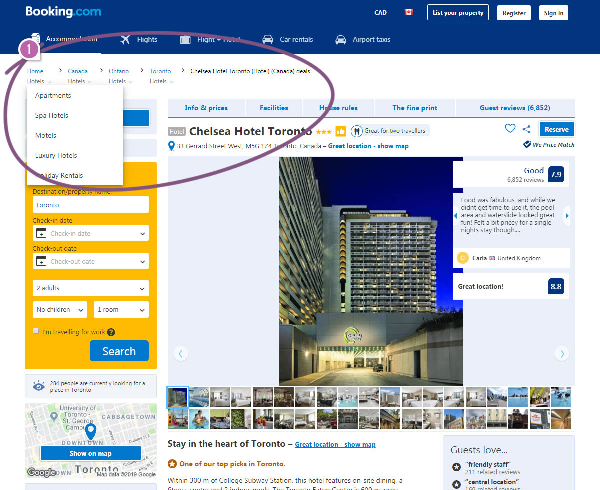 Booking ran a sitewide experiment where they tested two types of breadcrumb navigation. The contending variation showed a breadcrumb with two dimensions: displaying the geographical hierarchy of how deep someone is within the site (as expected), and also displaying a menu (on-click) with a secondary dimension of stay types for each level. It might have seemed like a nice idea but it didn't cut it. As the a/b test completed, the idea was rejected in favor of the old-school breadcrumb approach. Nice try booking. :)