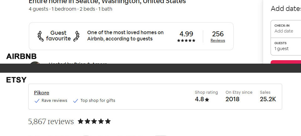 Whereas Airbnb starts off with a very strong headline (Guest Favorite) which then is further clarified with a longer statement, Etsy shows a more ambiguous store name (ex: Pikore in this case). Perhaps these store names may be meaningless in some instances. Etsy's "Rave reviews" reference is also questionable.