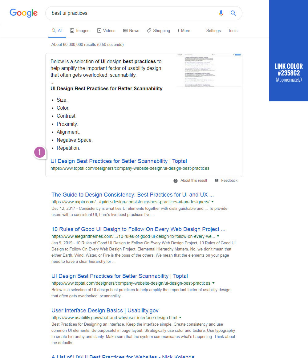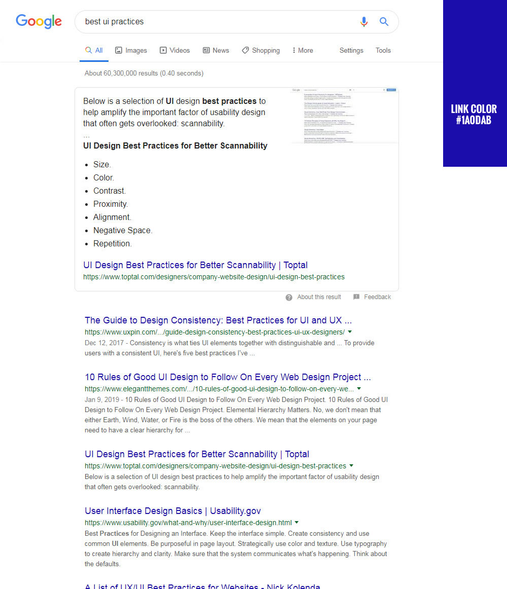 It's been a decade since it was first discovered that Google has famously tested those 41 shades of blue. Last month I discovered that they began experimenting with link colors on their search results screen - once again. This time Google tested a lighter blue with a lower contrast which turned out that they rejected (most likely due to a negative experiment result).