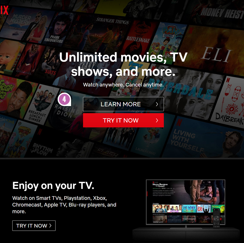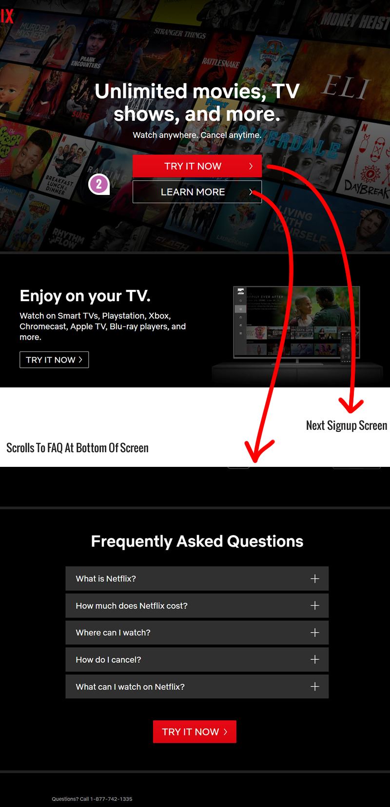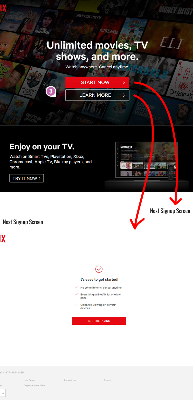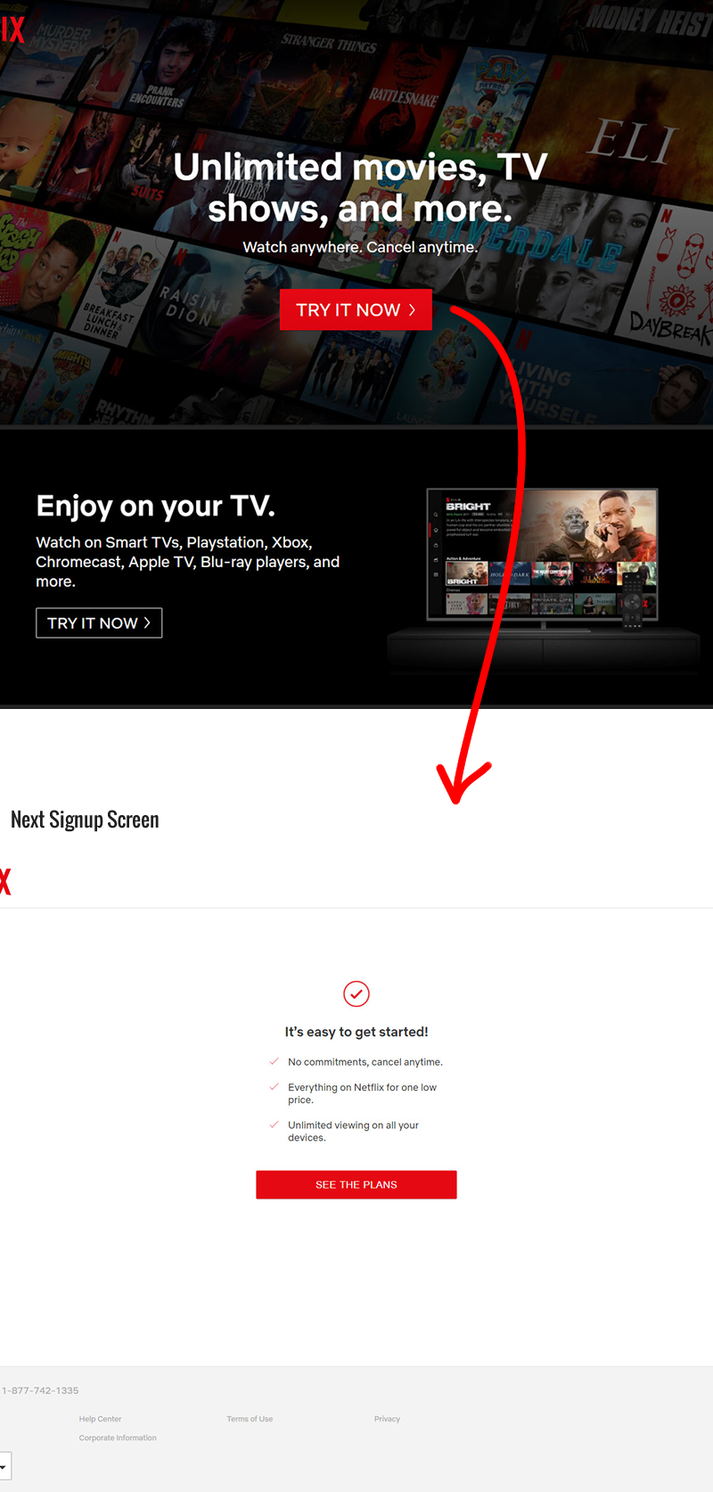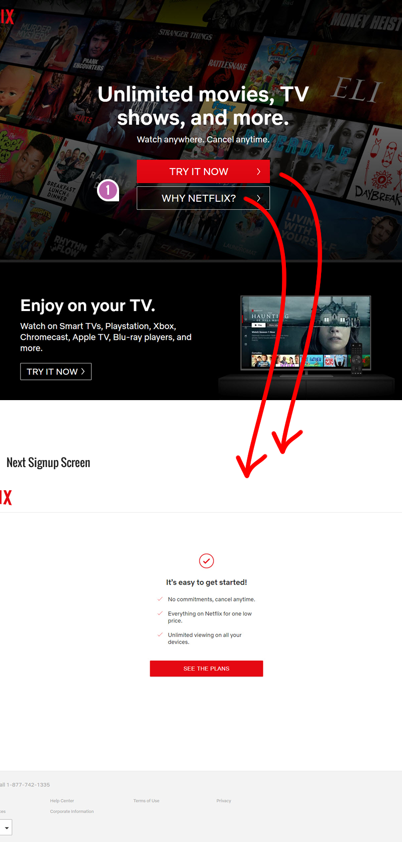 In this variation, the second button "Why Netflix" has been added below the primary one which simply acted as a duplicate link to the next signup screen. Given that both buttons link to the same screen, we can call this button somewhat of an artificial one. :)