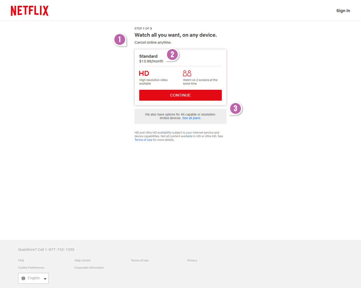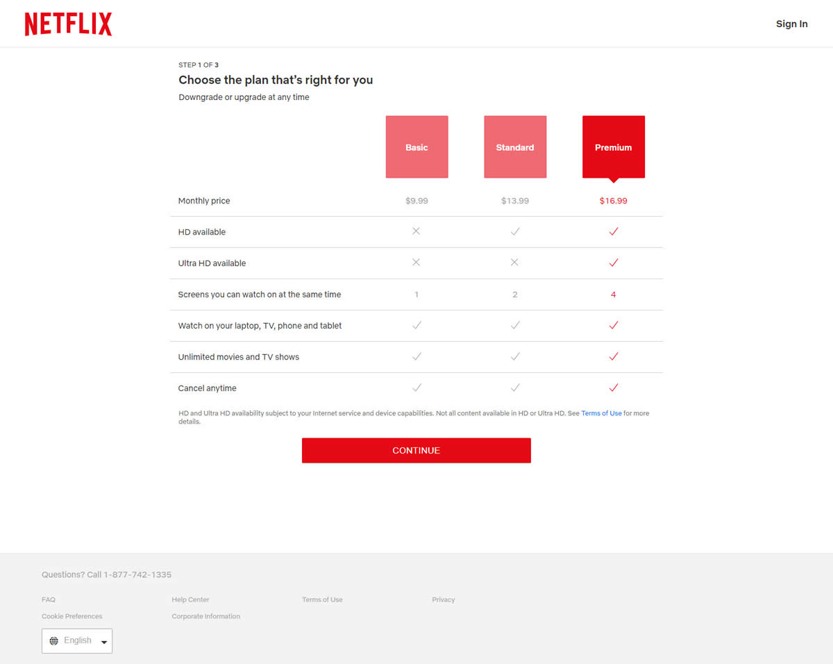 Netflix made a bold move and challenged their traditional 3 plan pricing page with a preselected single plan recommendation. Clear and equally balanced choice vs. a single mid tier plan. Fastforward another few weeks and it looks like the experiment completed with the traditional 3 plan keeping its place (they are running some other tests there actually which we're hoping to report on in the future). :)