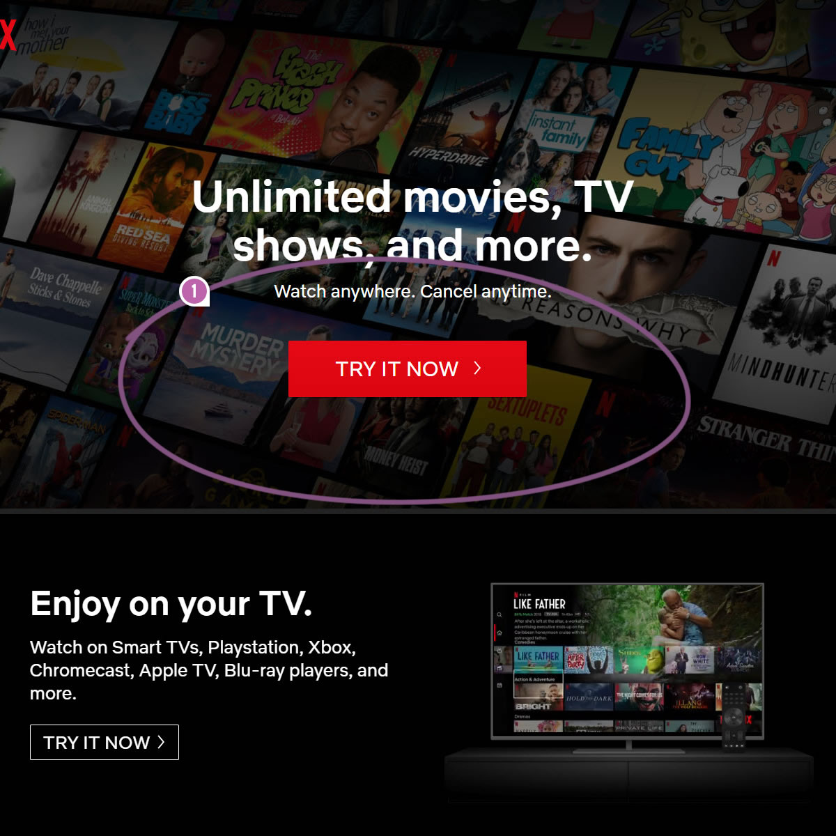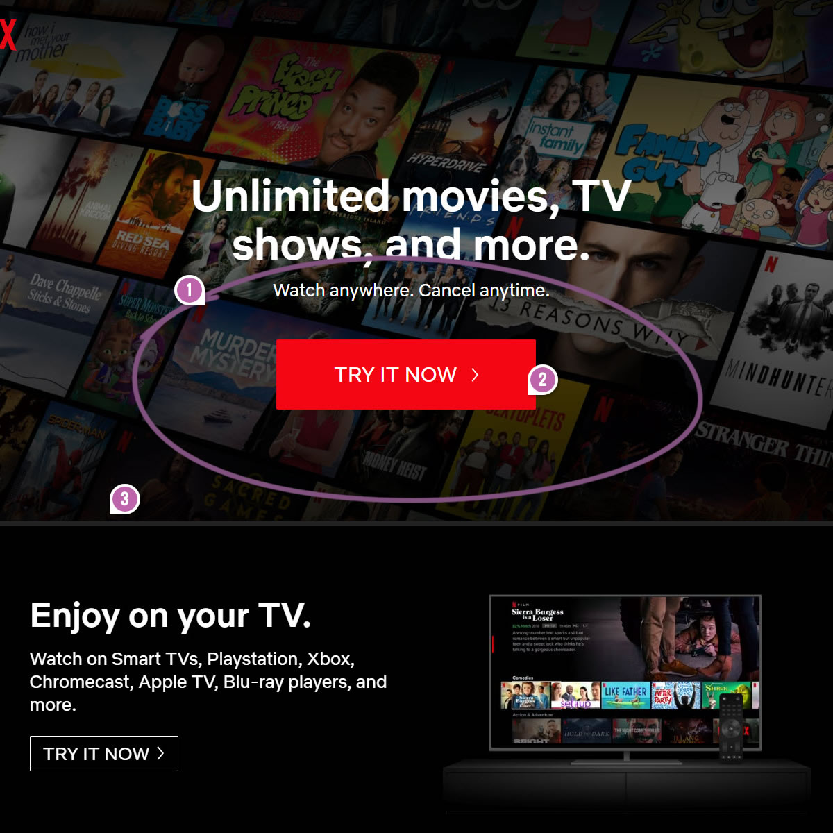 Sooner or later design properties should reach optimums for their given contexts. That is, UI elements will become just right - not too big and not too small, or not too high and not to low, etc. In this leak, it seems that Netflix has approached such an optimum when they tested various button sizes on their landing page. Given that form elements and buttons should generally be bigger, it was inevitable for this new evidence to appear as an example of a button being simply too big - as seen in this beautiful experiment. :)