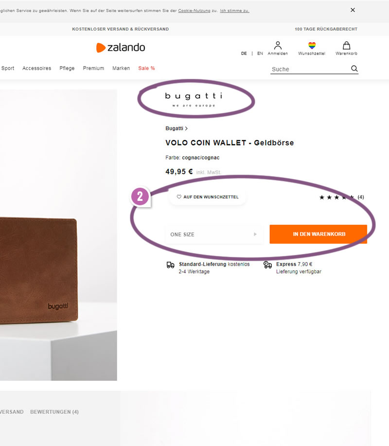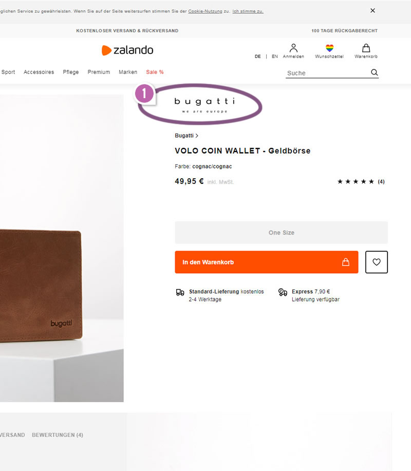 But what about the presence of the additional Bugatti product logo? It's difficult to guess what type of effect this might have had if any. One thought (a big guess) is that perhaps having two logos (Zalando vs. Bugatti) creates some uncertainty about who might fulfill the order. And if Zalando is already trusted, well then, perhaps less is more. Of course this is simply a hypothesis. :)
