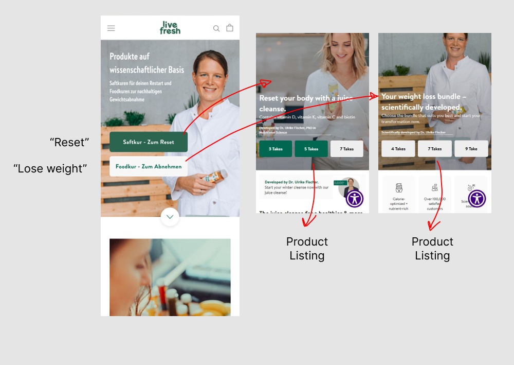 In this experiment, the homepage interaction, headline, and images were changed. In the control, users saw a single “Shop Now” button leading directly to products. In the variation, users first chose between “Reset” or “Lose Weight,” then selected a duration in days before being shown products. The impact on sales was measured.