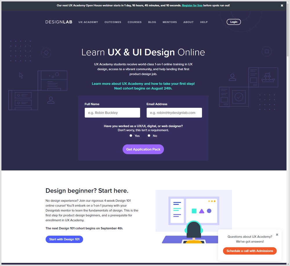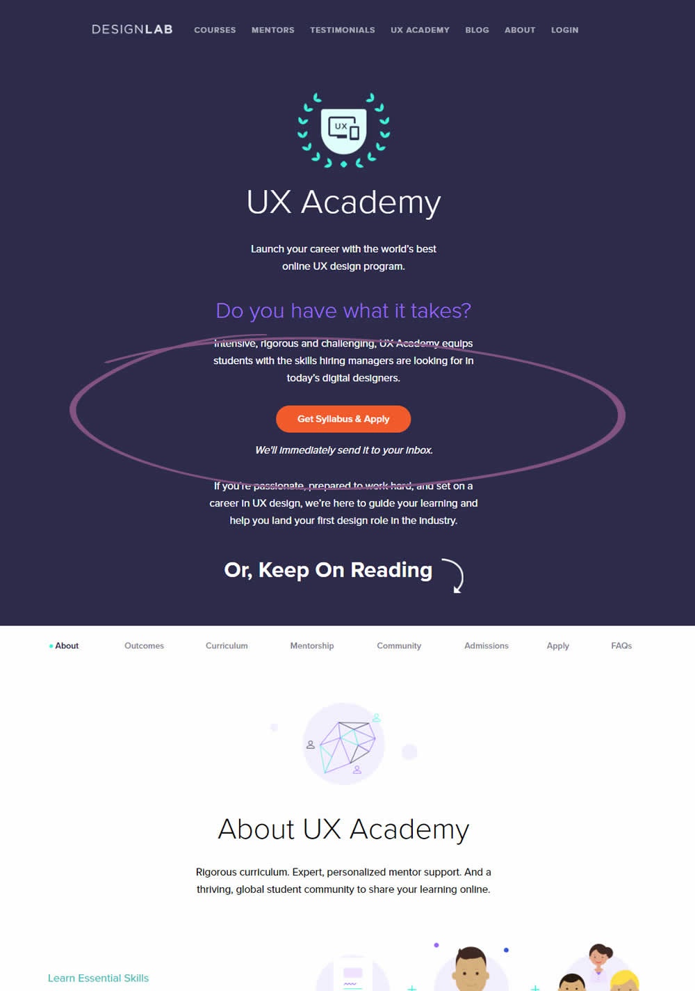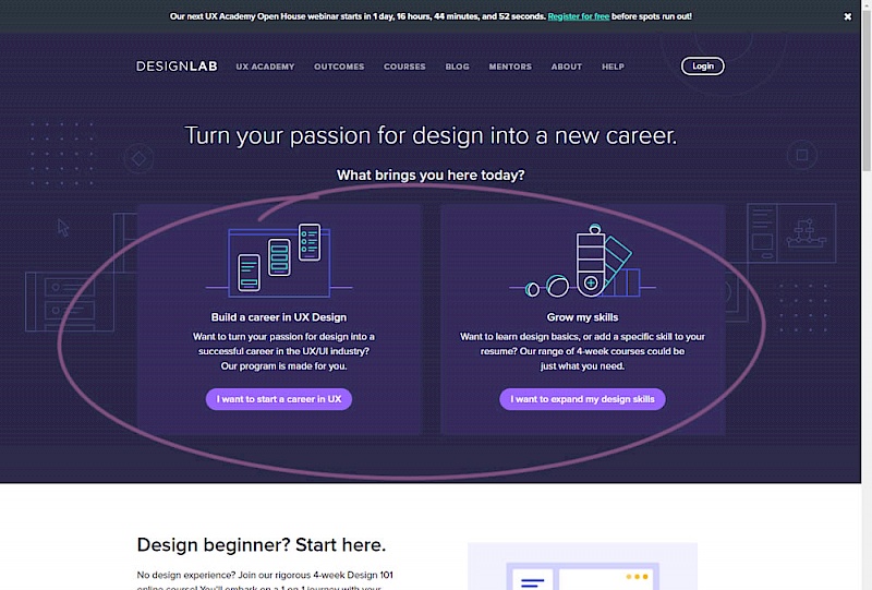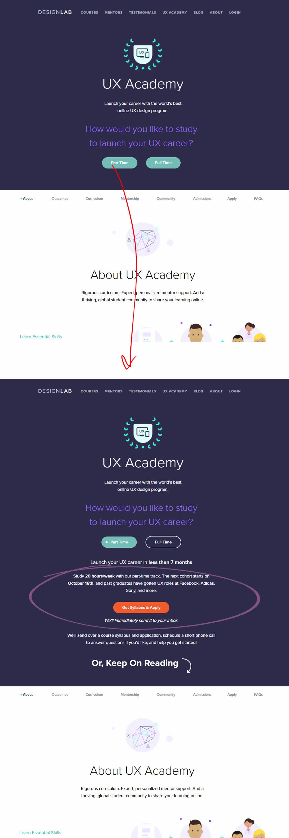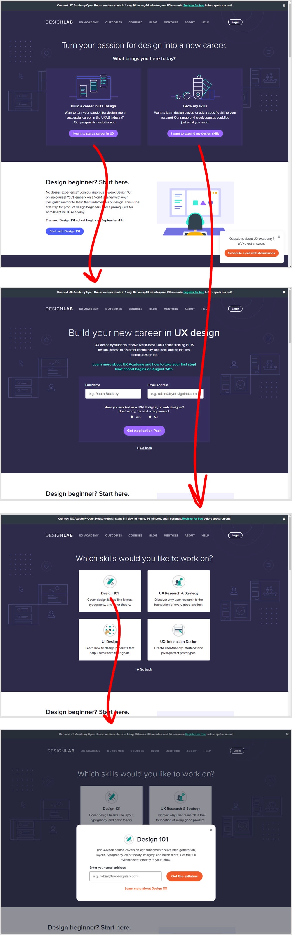 In this experiment, instead of showing a single-focused lead form (for the UX Academy Program), users were asked to express a wider set of choices first (for the UX Academy or shortter set of skill-based courses). The experiment measured overall leads for both types of programs.