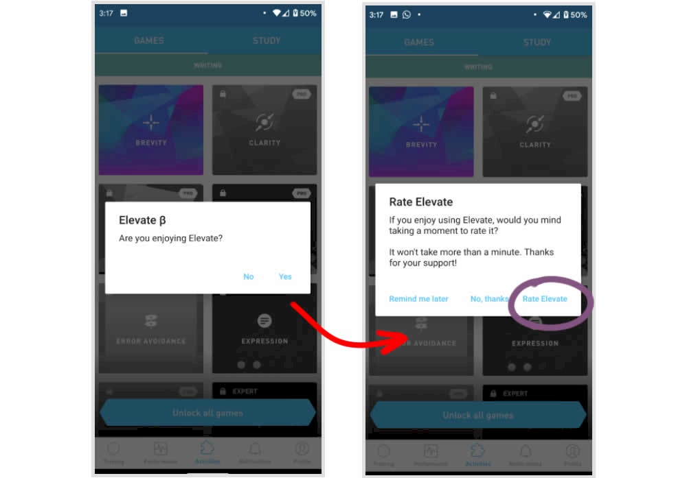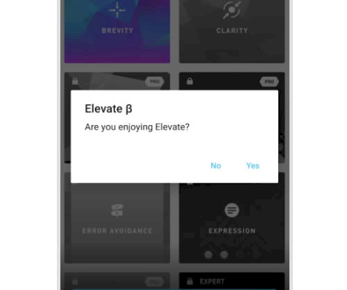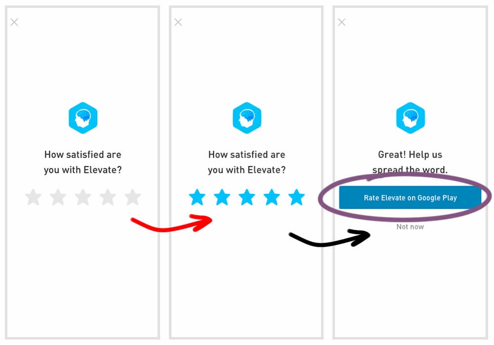 This experiment aimed to increase the number of application ratings from within the Elevate app. Success was measured by the number of users going towards Google Play to create the rating. The control version prompted users if they wanted to rate the app with a simple yes and no answer. The variation however presented the rating choice right away in the form of 5 stars - enabling users to express their choice sooner.