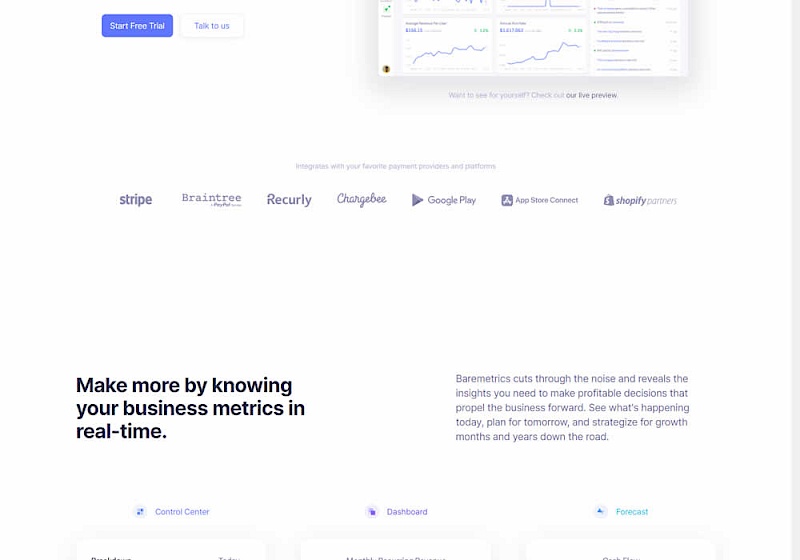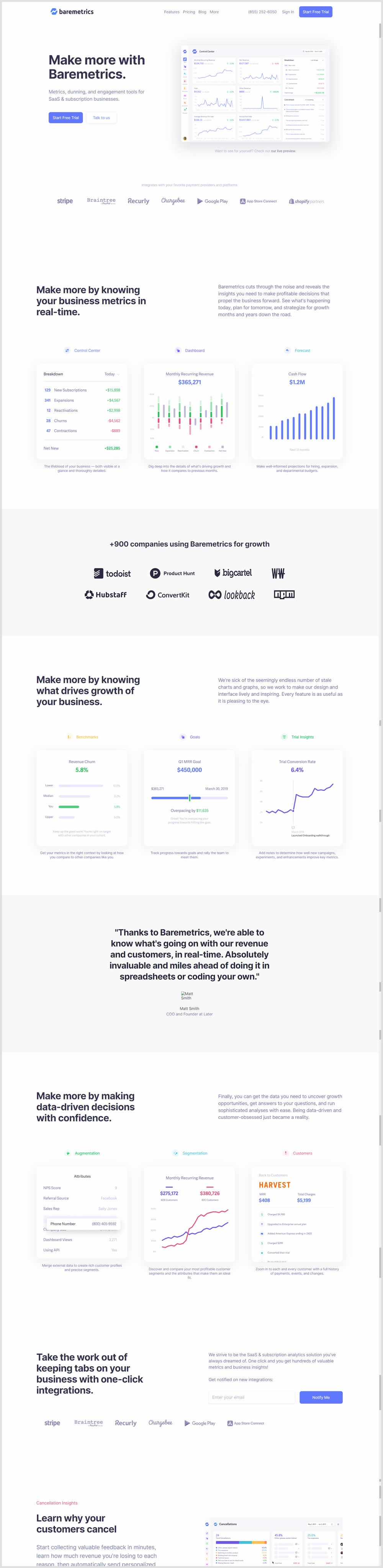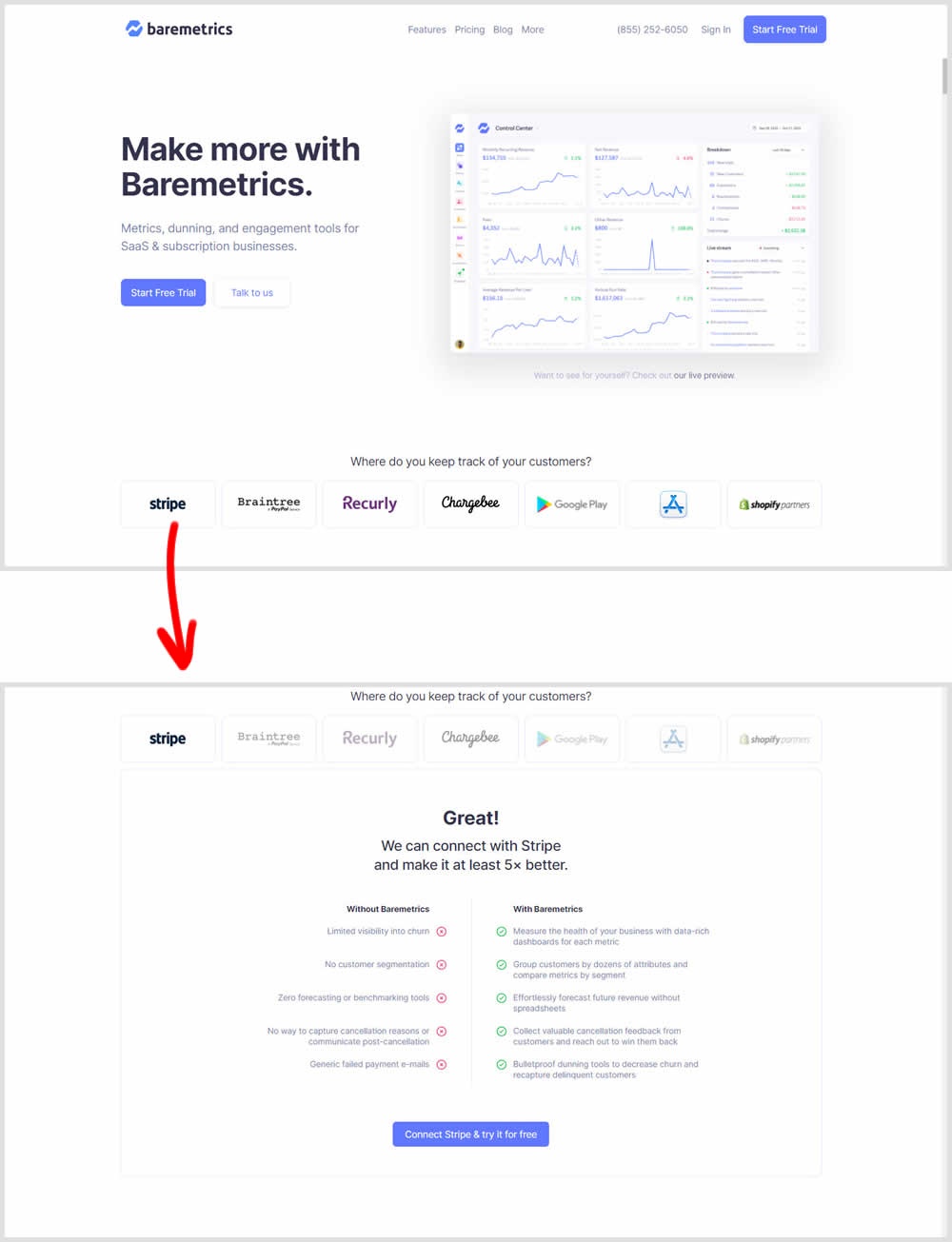 In this experiment, static integration logos were replaced with selectable ones that reassured users to signup. After clicking an integration logo, a comparison chart would appear showing how Baremetrics improves upon a selected payment processor, along with a call to signup. Impact on signups was measured.