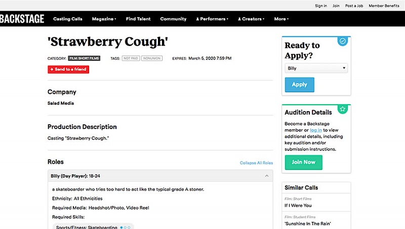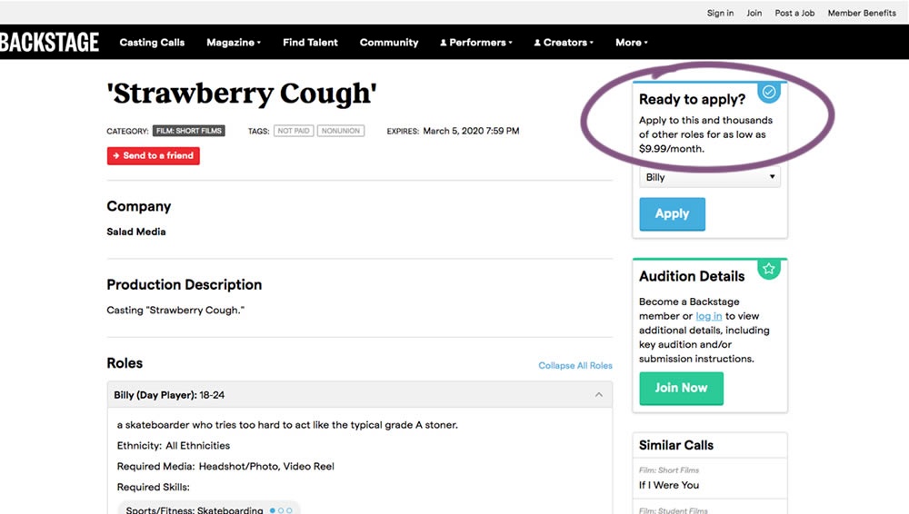 In this experiment on a casting call site, pricing information was shown beside the application button. This change shows the effect of setting a price expectation and being more clear that the application process is not free.