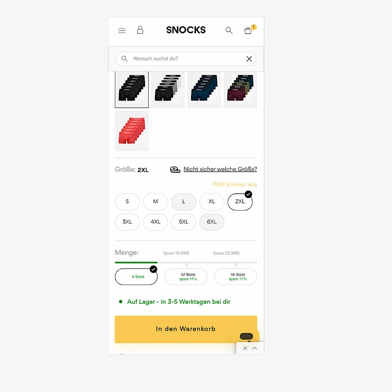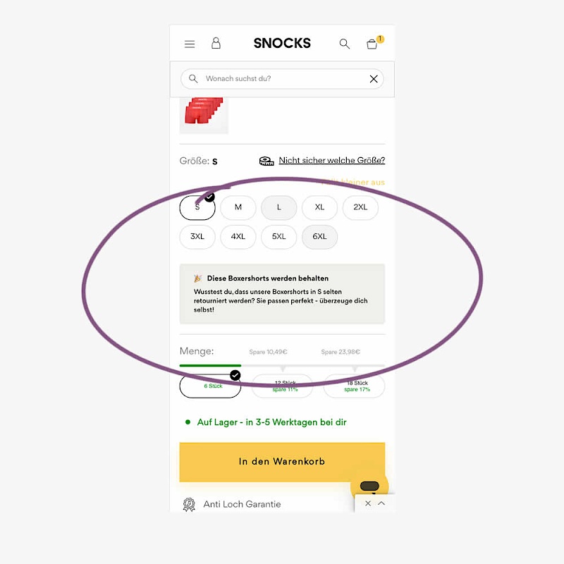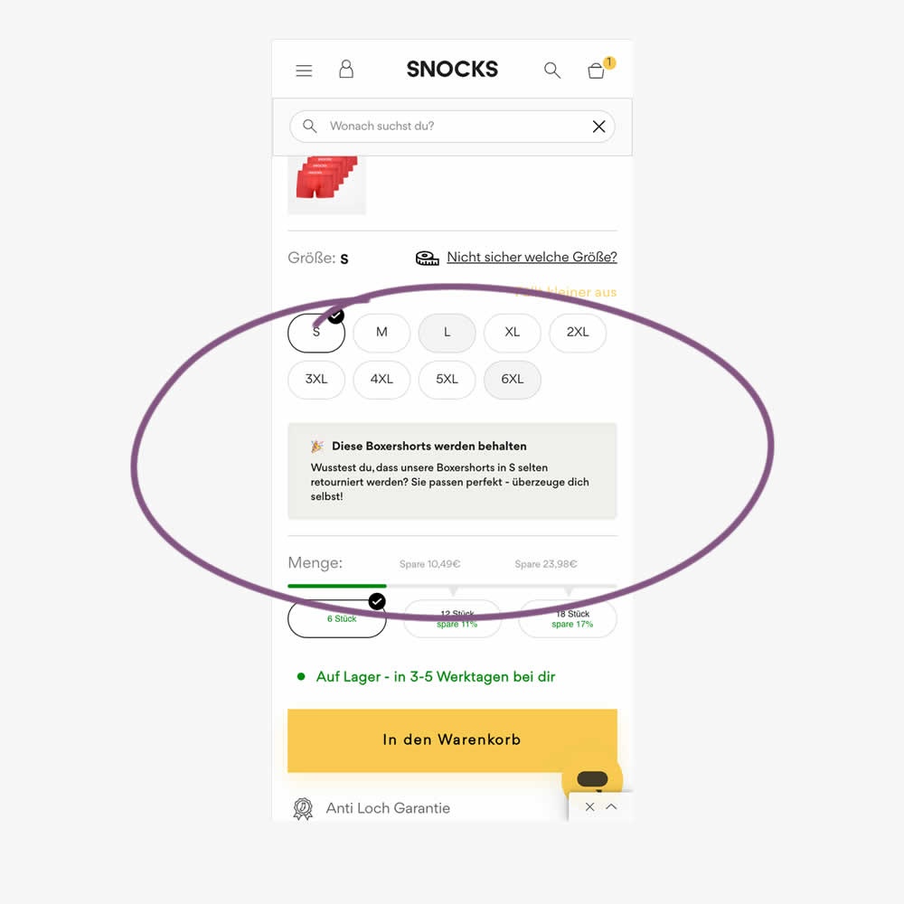 In this experiment, reaffirming copy was added for particular size options in the variation. Here is the translation from German: