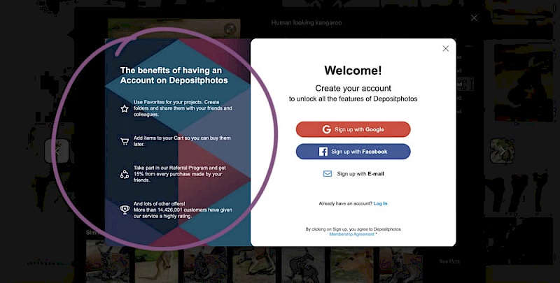 In this experiment from Conversionrate.store, the framing of the registration message was changed from a generic account creation one to a specific image selected by the user. The experiment started on a listing page of a stock photography / illustration site. The control showed a more generic message with benefits for signing up and making the purchase. Whereas the variation repeated the actual image that customers clicked on from listing pages - establishing continuity as well as providing a reason for signing up. Impact on sales was measured.