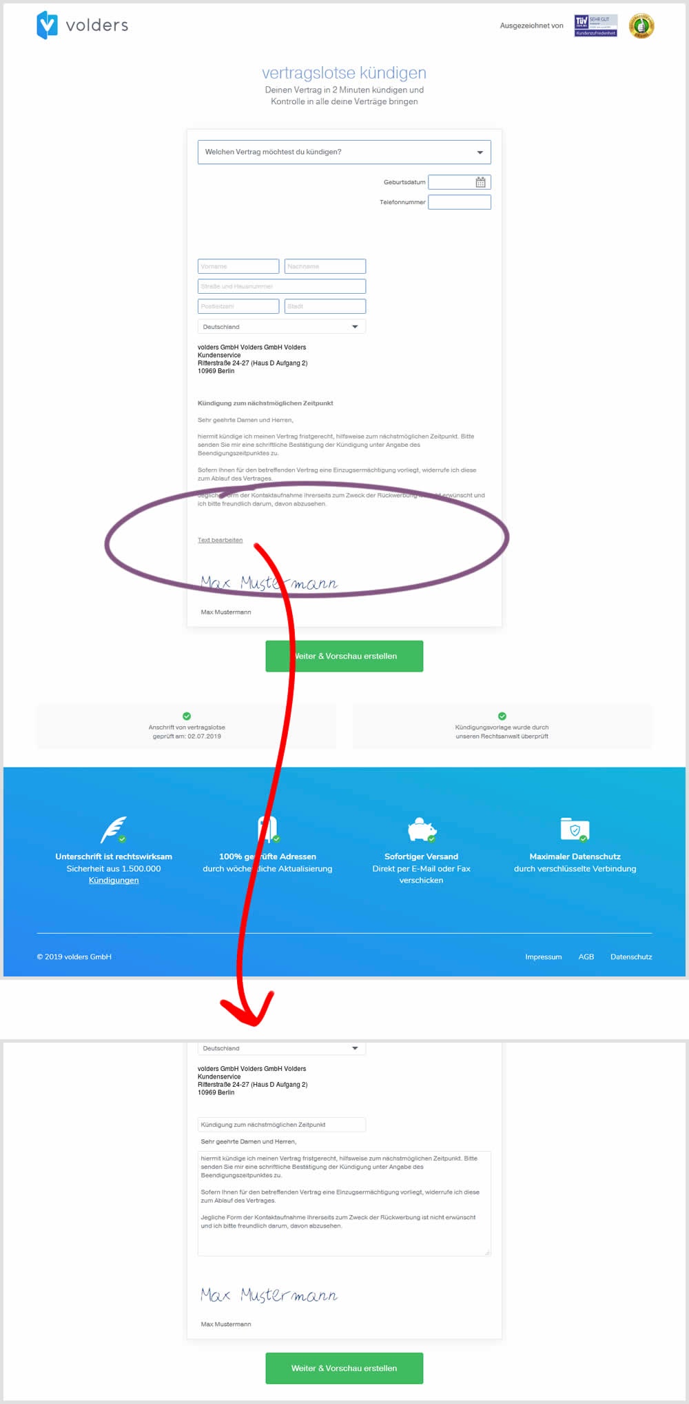 In this experiment, an editable contract cancellation letter was tested against a non-editable one. The editable letter first appeared in a text state, which required a click on a link in order for it to be transformed into an editable textarea field.