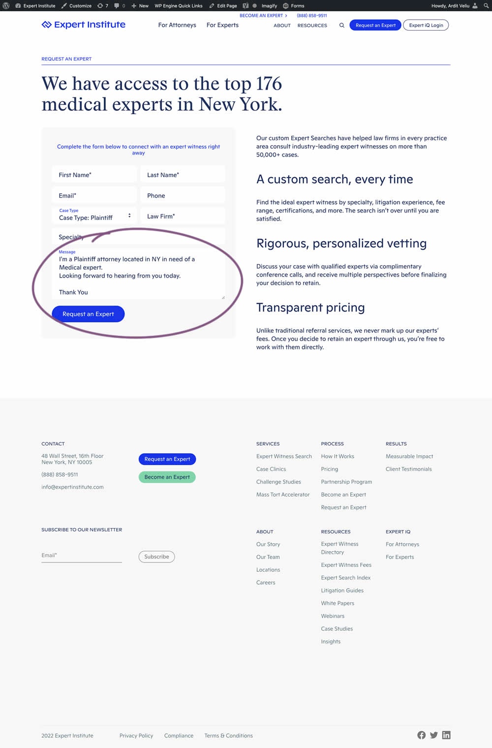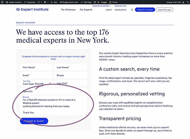In this experiment, the copy of an input textarea on a lead form was used to summarize a user's choices. Instead of showing using a generic "Message" statement, the variation use the following formula: "I'm a [Lead Type] located in [State] looking for [Expert Type]. Looking forward to hearing from you today. Thank You." Impact of leads was measured.