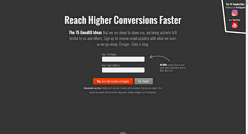 In this experiment a different headline was tested. "Reach Higher Conversions Faster" vs. "Learn From What We Try And Test".