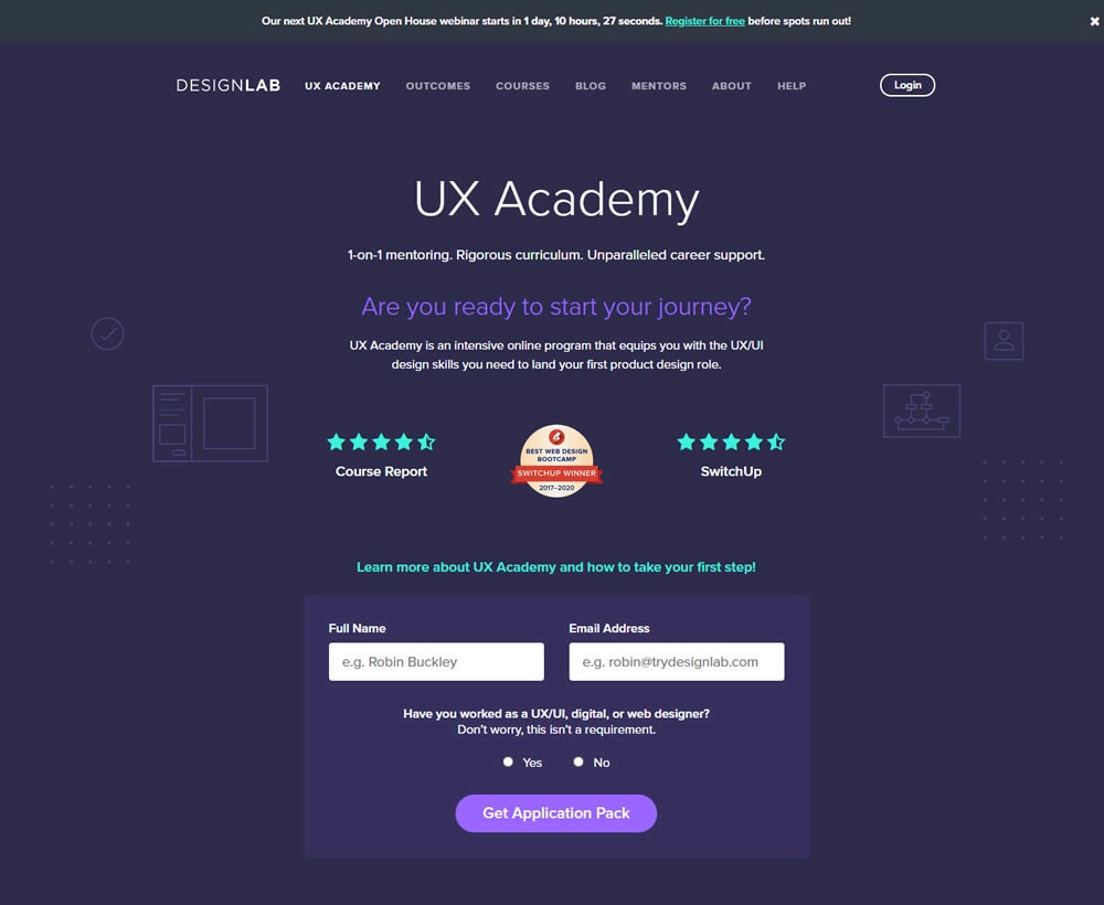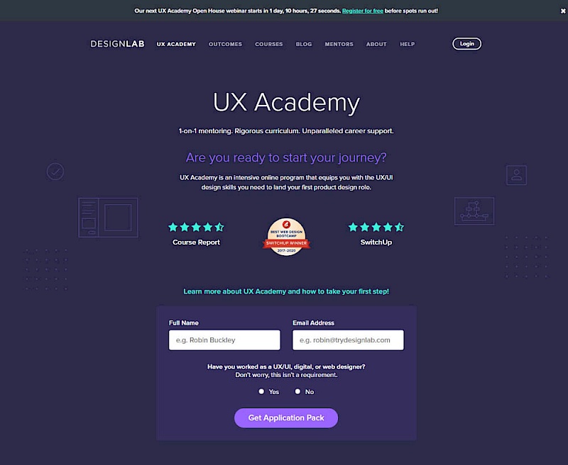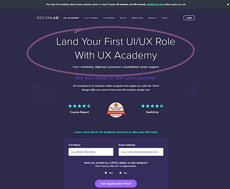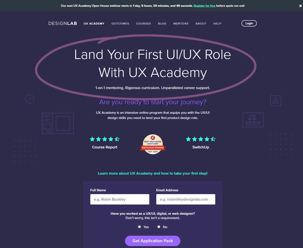 In this experiment, the headline was changed to focus more on the end-goal of the UX Academy program - that of landing your first UI/UX role.