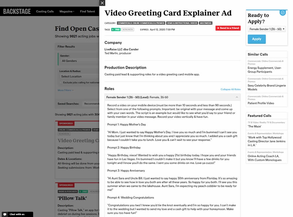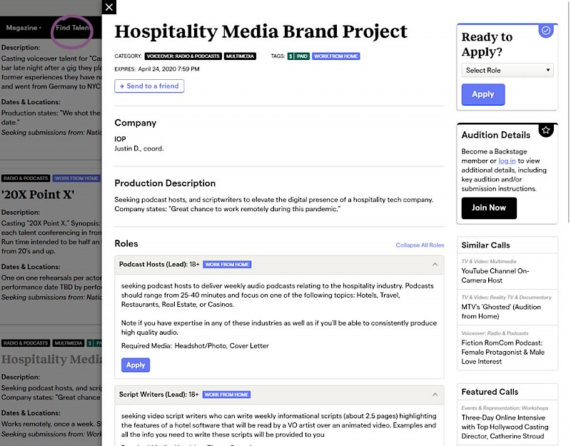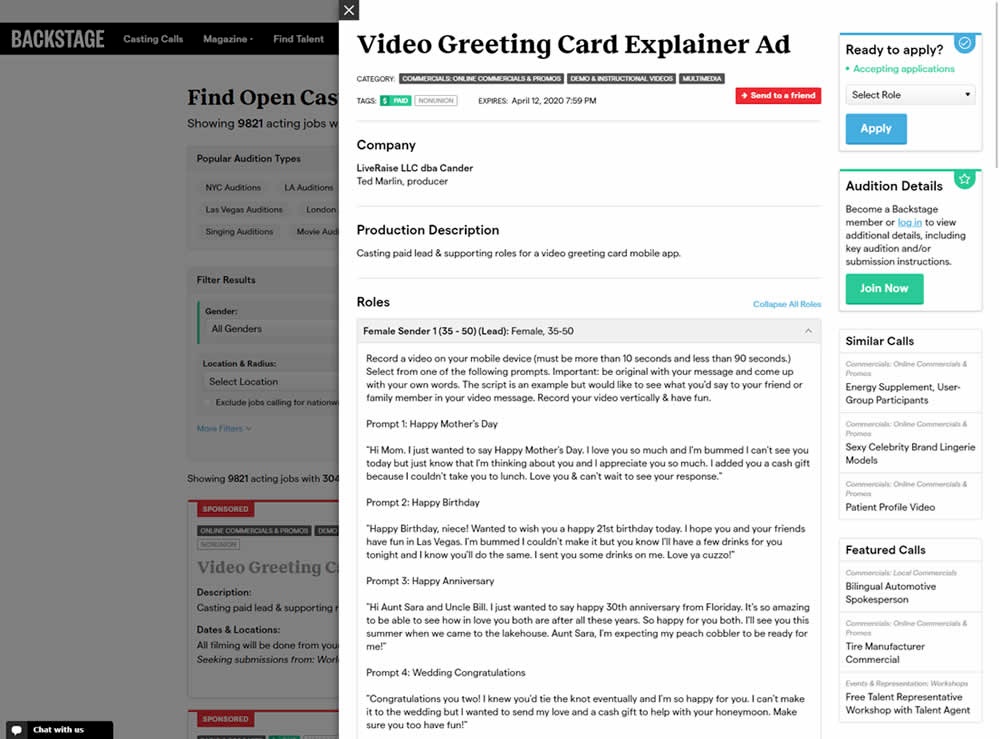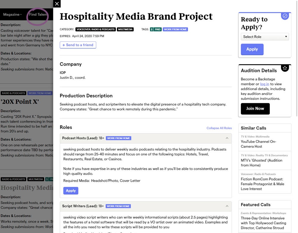 In this experiment, the active availability of a casting call (job offer) was was made more prominent using green text: "Accepting applications". The variation also made the "Join Now" button more prominent as an alternative path to signing up for a membership. The experiment reports on three metrics: clicks on apply, application starts and premium membership sales (measured a few steps further in the funnel).