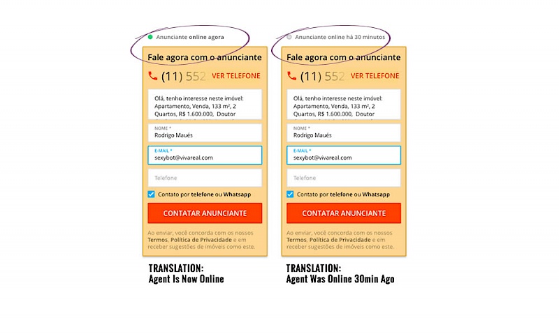 In this experiment, a lead form on a listing page showed whether an agent was recently online or not. The diplayed had two statuses: either indicating that someone is online now, or the most recent time they were online in minutes.