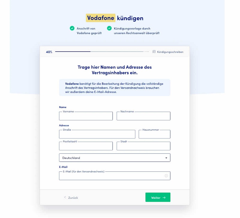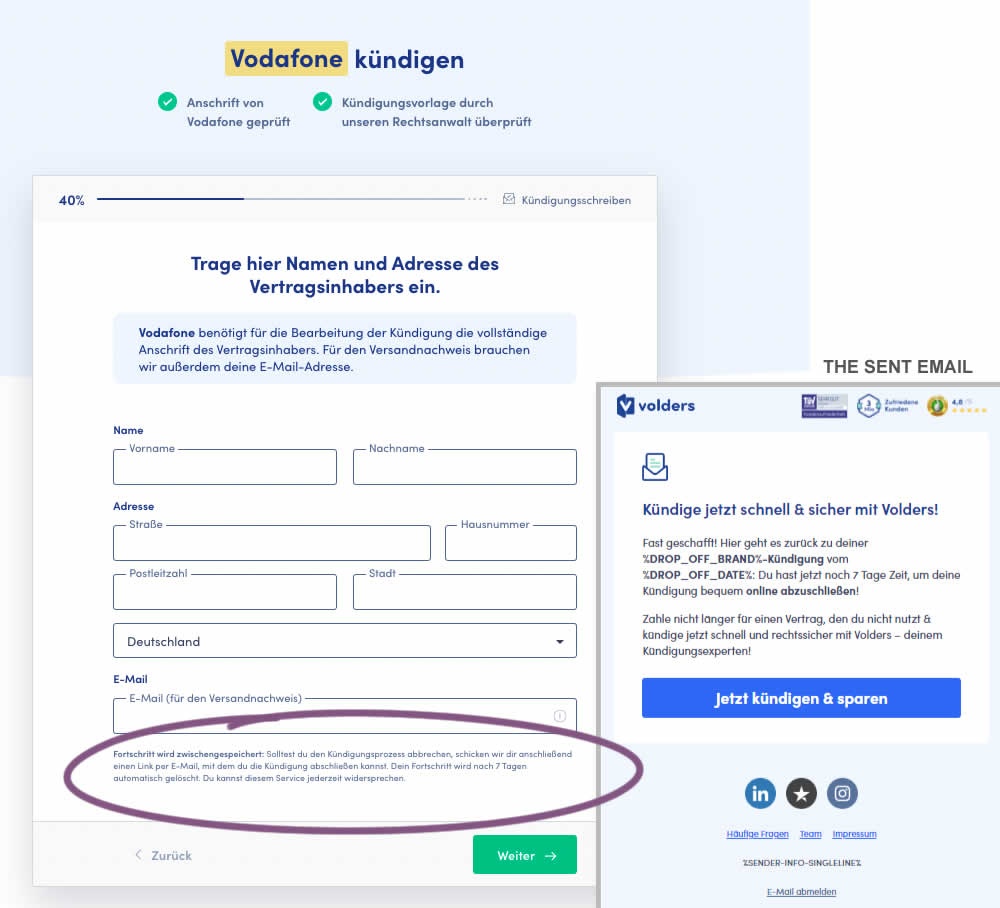 In this test 1) a passive hint communicated to users that their data will be saved for 7 days for them to be able to continue their cancellation later and 2) dropped off users were targeted with an email campaign within the first 4 hours after drop off. The reminder email linked users to a shipping page (checkout page) without them requiring to fill out their personal, contract information one more time.
