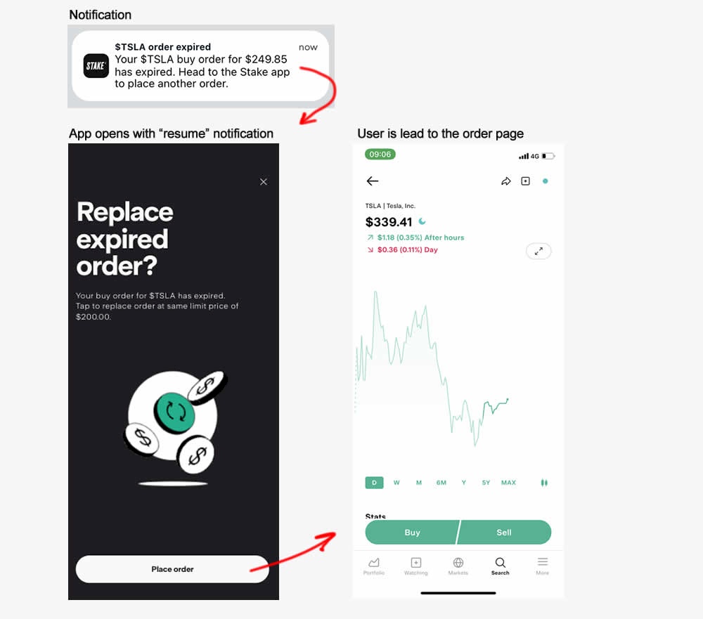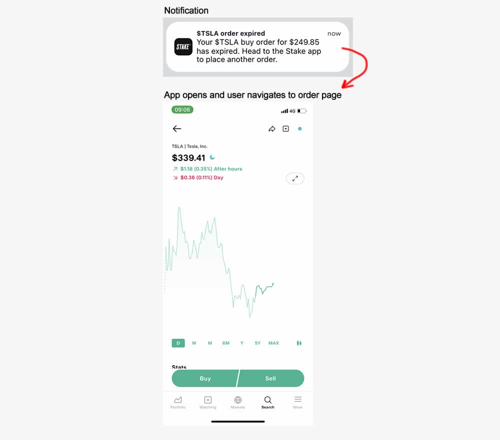 This experiment started right after users of a trading app received trade order expiry notification (for a security trading app). In the control, after clicking the notifications, users would have to navigate to the trade themselves. In the variation, 1) an additional step was added which informed what happened (an order was not place and expired) and 2) they were automatically send to the order page. Impact on orders placed was measured.