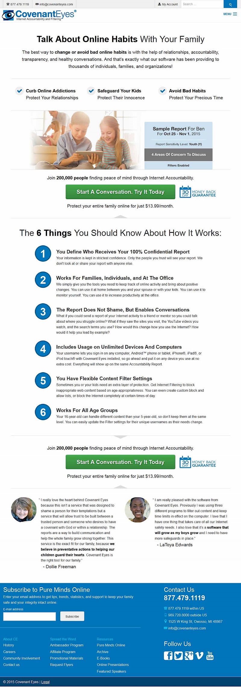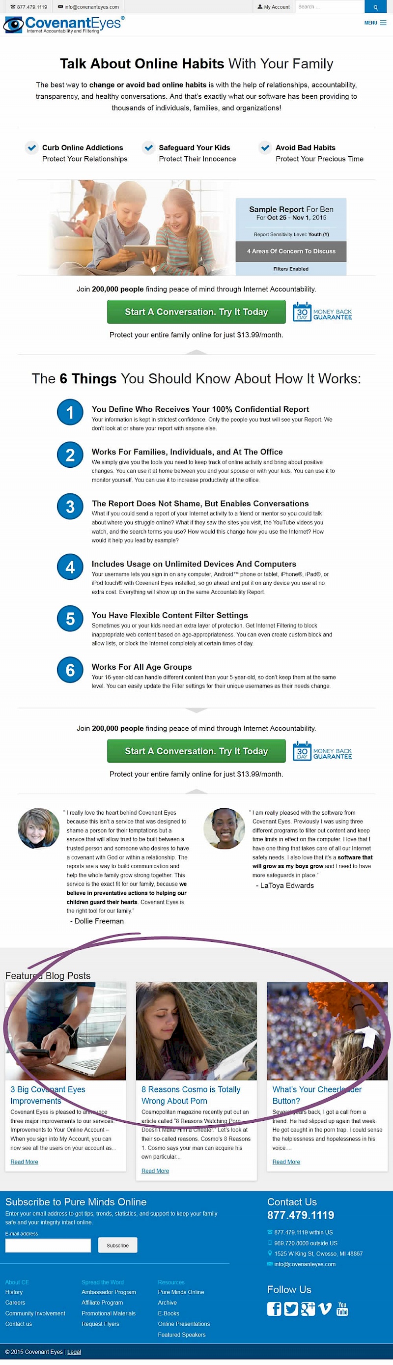 In the B variation, 3 blog posts were referenced at the bottom of the homepage. Each of the blog post articles also contained strong copy to present the problem the service was helping customers with (porn addition) - along with clear calls to start a subscription (the primary metric).