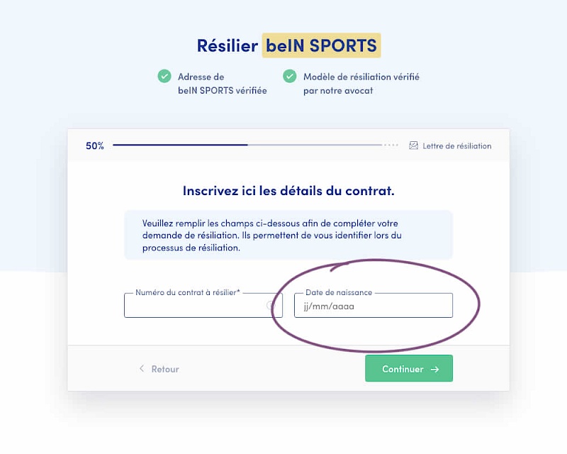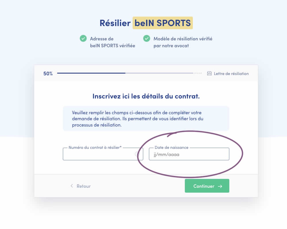 A birthdate field was removed during a signup process for a paid contract cancellation service. Impact on progression (next step) and sales (completed transactions) was measured.