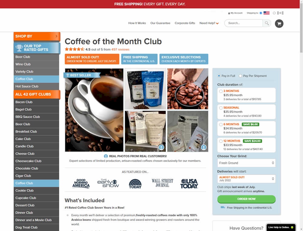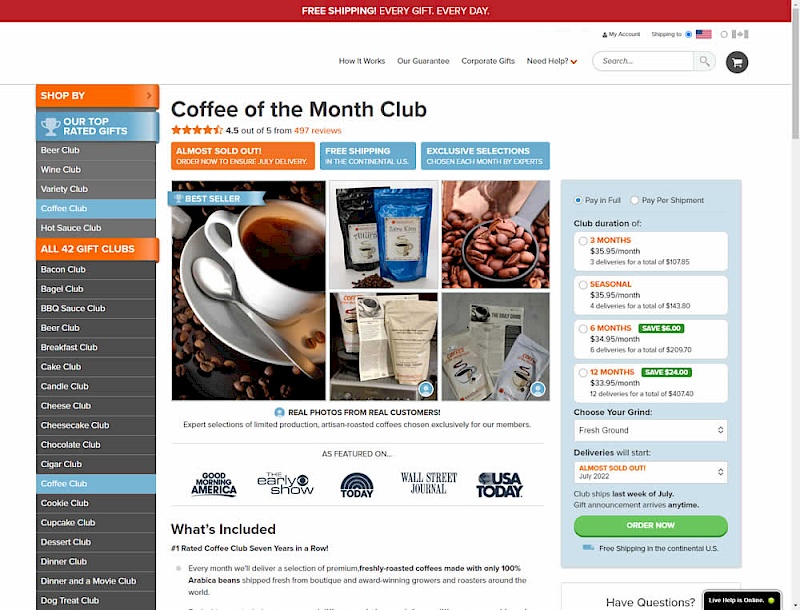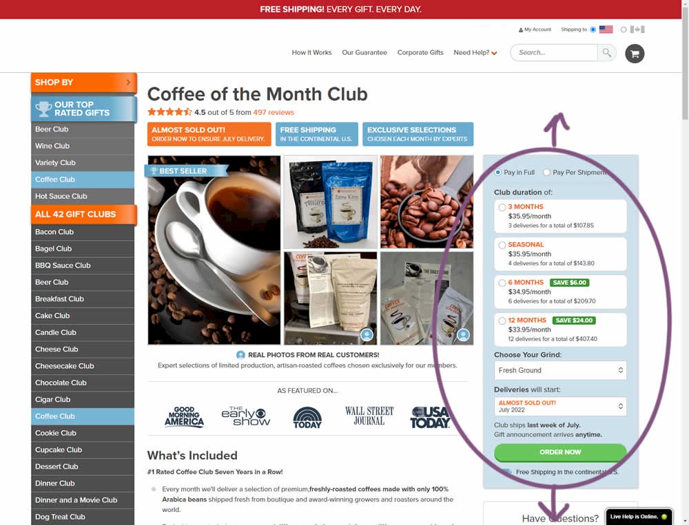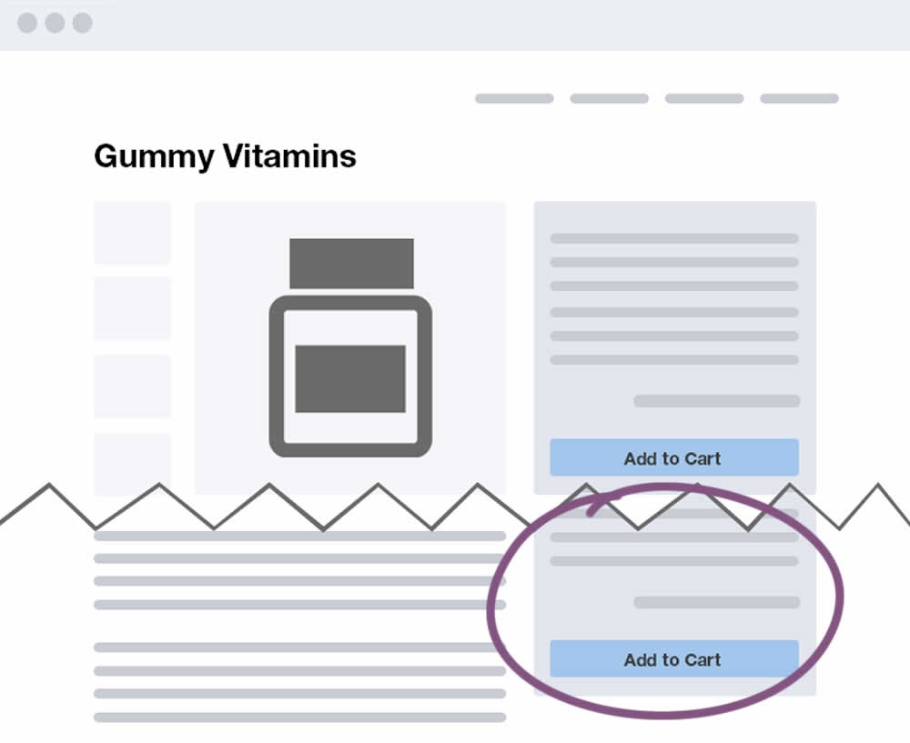 In this experiment, a floating sticky bar was added on product pages. The sticky elements only appeared after users scrolled beyond the fixed buy box  area that is relatively high on the page (visible on the control screenshot). The sticky bar contained three elements: a button to configure up to three product choices, a flavor selection pulldown, and the add-to-cart button.