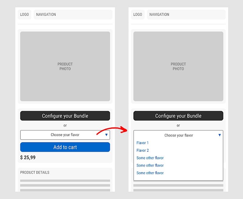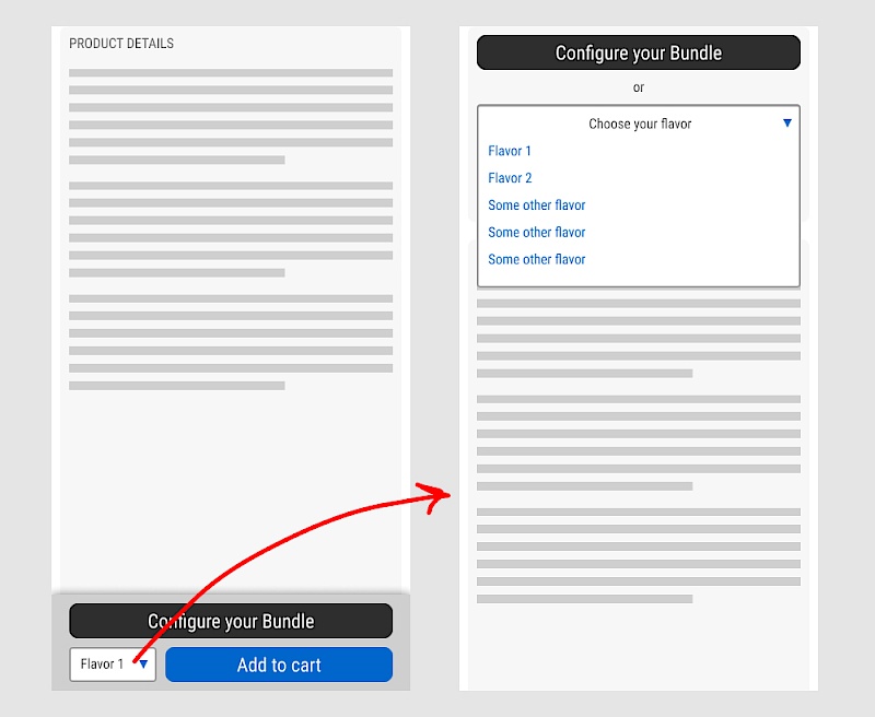 In the variation, when users clicked on the flavor pulldown three things happened. First, they were anchored back to the top of the buy box. Second, the floating sticky disappeared. And third, the flavors pulldown automatically expanded (overlapping the original primary add-to-cart button).